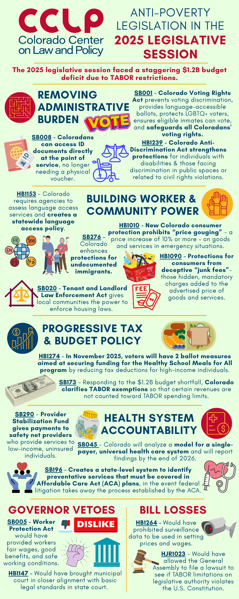 Outside of our priority bill, three other significant bills we supported became law in May 2025. SB25-001, Colorado Voting Rights Act, further strengthens Colorado’s voting protections amid backsliding federal voting rights. The new law prevents voting discrimination, provides language-accessible ballots, protects LGBTQ+ voters, ensures eligible inmates can vote, and safeguards free and fair elections for all Coloradans. In addition, HB25-1239, Colorado Anti-Discrimination Act, strengthens protections for individuals with disabilities and those facing discrimination in public spaces or related to civil rights violations. HB25-1279, State-Level Data for Colorado Works Program, seeks to improve data collection and reporting standards for the Colorado Works Program, Colorado’s Temporary Assistance for Needy Families (TANF) program. It will provide transparency of TANF fund allocations, ensuring resources are given to the most effective and necessary services.