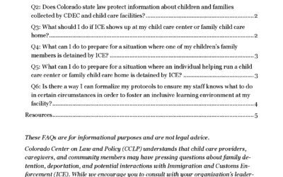 An FAQ guide on family detention, deportation, and potential interactions with Immigration and Customs Enforcement (ICE), for child care providers, caregivers, and community members. / Una guía de preguntas frecuentes sobre la detención familiar, deportación e interacciones potenciales con el Servicio de Inmigración y Control de Aduanas (ICE), para proveedores de cuidado infantil, cuidadores y miembros de la comunidad.