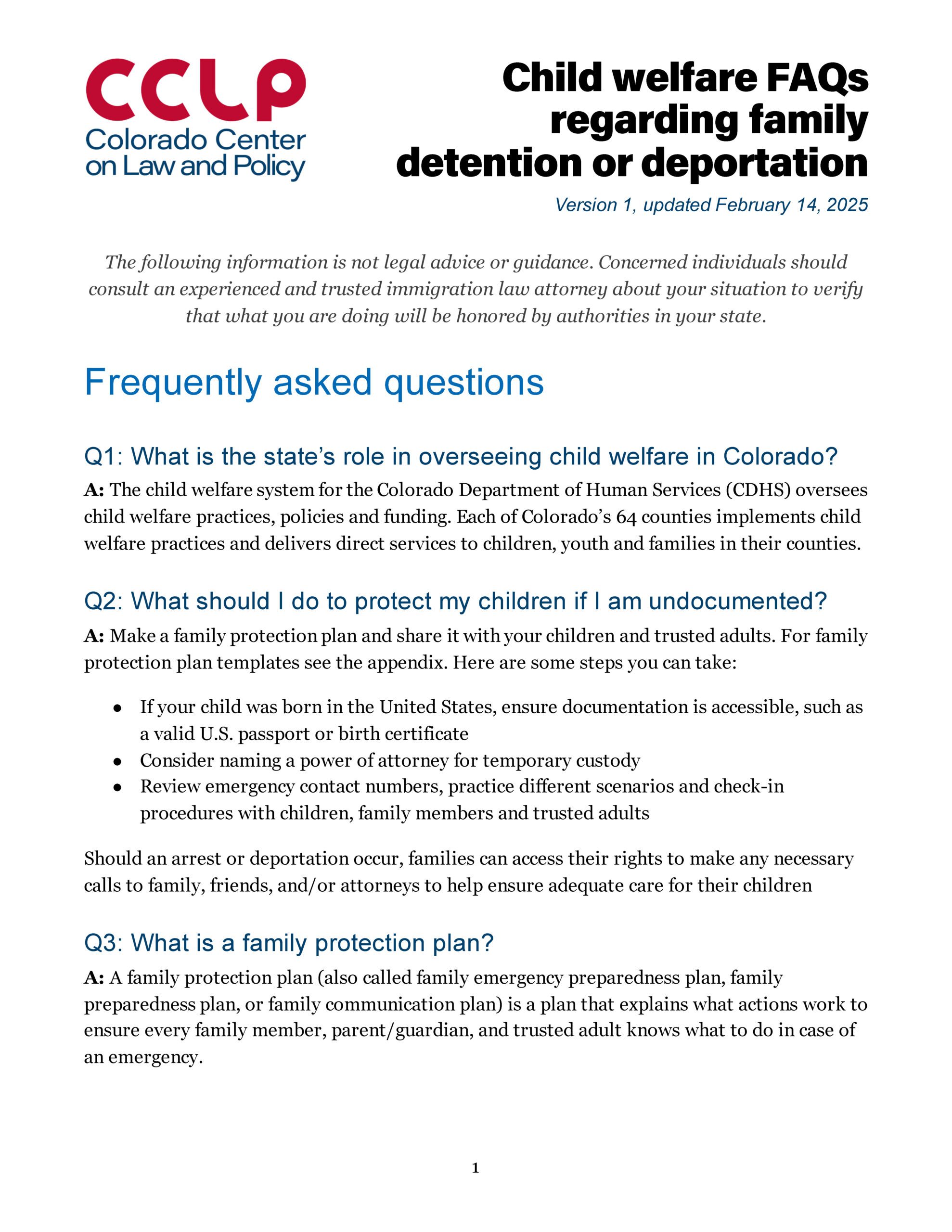 This document is a comprehensive FAQ guide on child and youth welfare considerations for families affected by detention or deportation in Colorado. It outlines the state’s role in child/youth welfare, the importance of a family protection plan, and options for kinship care. It also addresses what happens if a parent is detained, including the involvement of county human services, foster care, and potential reunification efforts. The document provides resources for emergency planning, legal rights, and support services available to impacted families, emphasizing the need for preparation and community support.